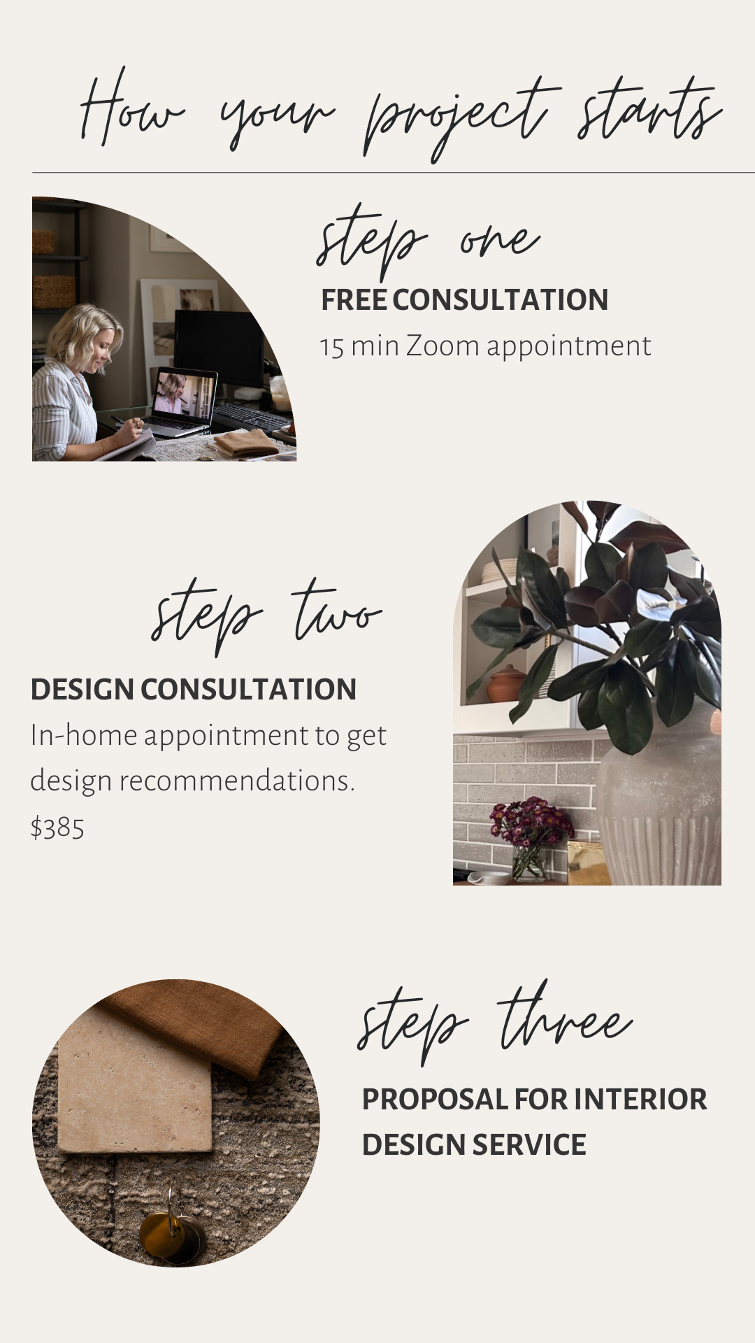 This $385 service, called the “Design Consultation”, takes 1-2 hours depending on the size of your home and scope of your upcoming project, and can be done either in-home or virtually. At this appointment you walk Brooke through your home and get her feedback on your ideas, get all of her recommendations for the , and get answers to all of your questions.