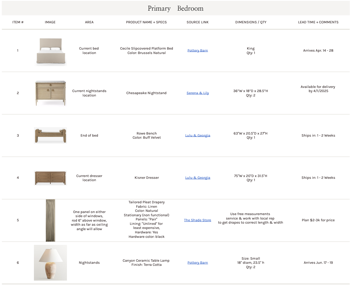 Deliverables: 1. Design board with selections 2. Drawing of furniture layout 3. List of selections with purchase info